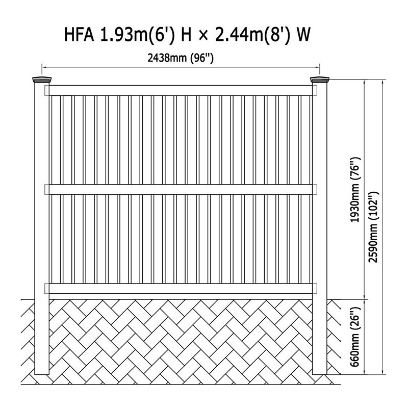 Aita seisoo 72 tuuman tavanomaisella korkeudella, jolla on muokattavissa olevat vaihtoehdot eri korkeuksille, ja aita luo kutsuva este samalla kun valon ja ilman virtaaminen. Jokaisen paneelin vakioleveys on 96 tuumaa, mutta tarjoamme myös erilaisia leveysvaihtoehtoja yksilöllisten tarpeidesi mukaan.